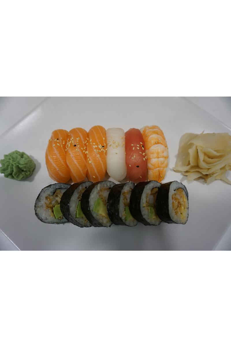 6 nigiri: 3 laks, 1 kveite, 1 tuna, 1 scampi og 6 biter tempura futomaki