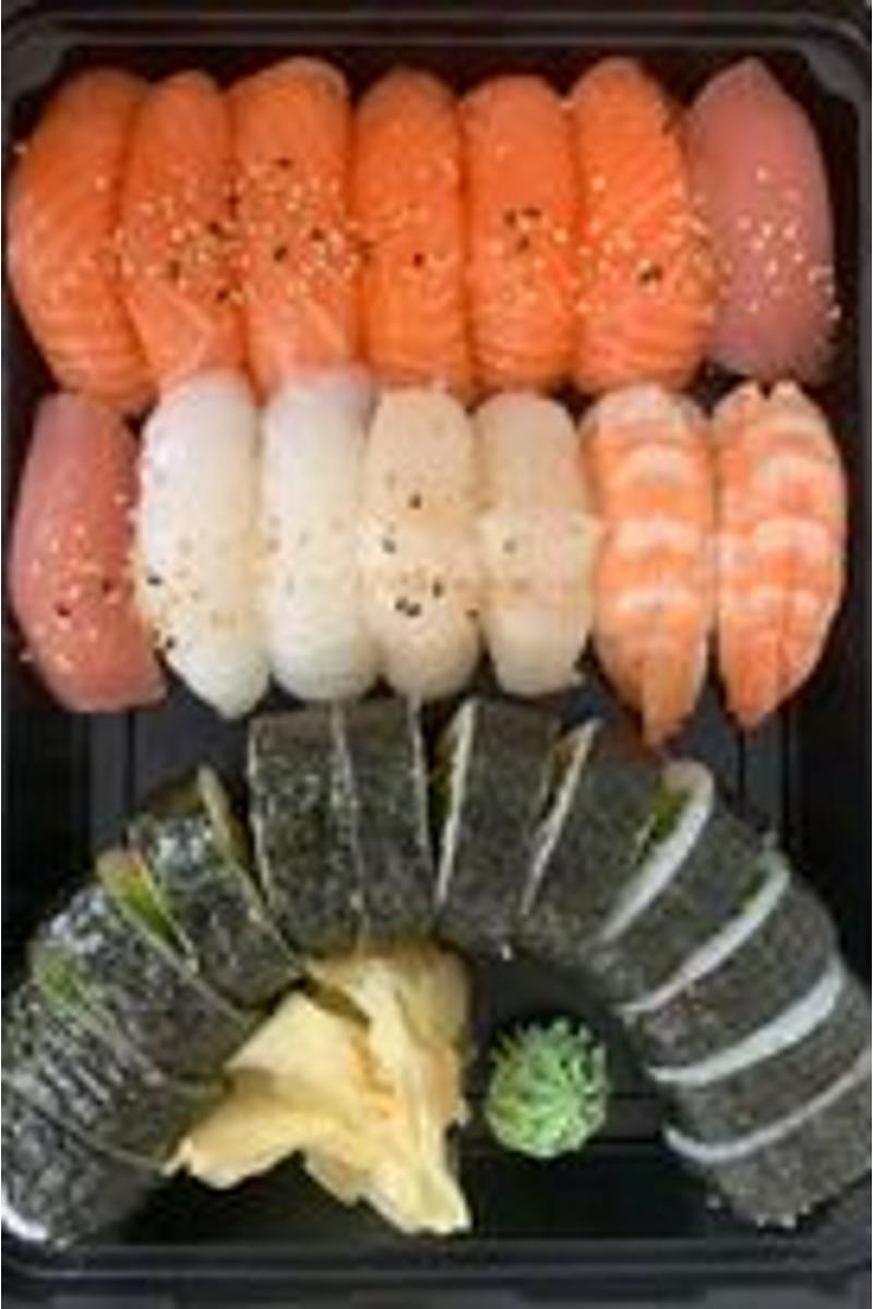 14 nigiri: 6 laks, 2 kveite, 2 tunfisk,2 scampi,2 kamskjell og 12 biter tempura futomaki.