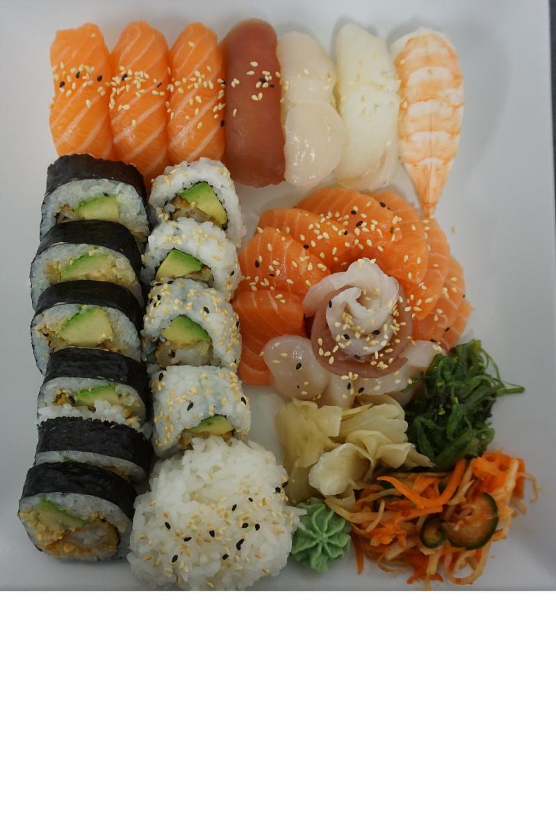 7 nigiri: 3 laks, 1 kveite, 1 tunfisk, 1 scampi, 1 kamskjell, 13 biter sashimi: 7 laks, 2 kveite, 2 tunfisk, 2 kamskjell, 10 biter maki, 6 biter tempura futomaki og 4 biter tempura maki.1.2.3.4.5.6