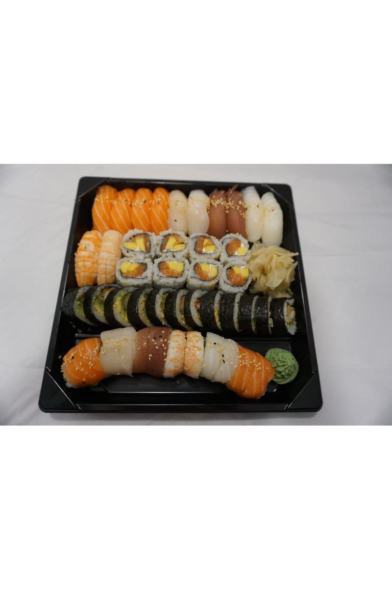 12 nigiri: 4 laks, 2 kveite, 2 tunfisk, 2 scampi, 2 kamskjell.30 biter maki, 12 biter tempura futo kylling, 8 biter mango philadelphia kremost og 10 biter rainbow maki.1.2.3.4.5.6.7