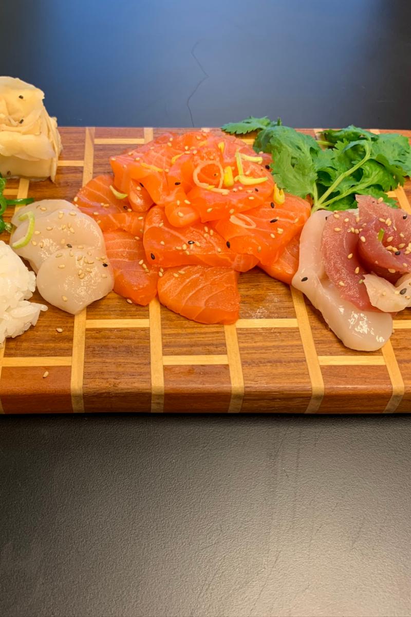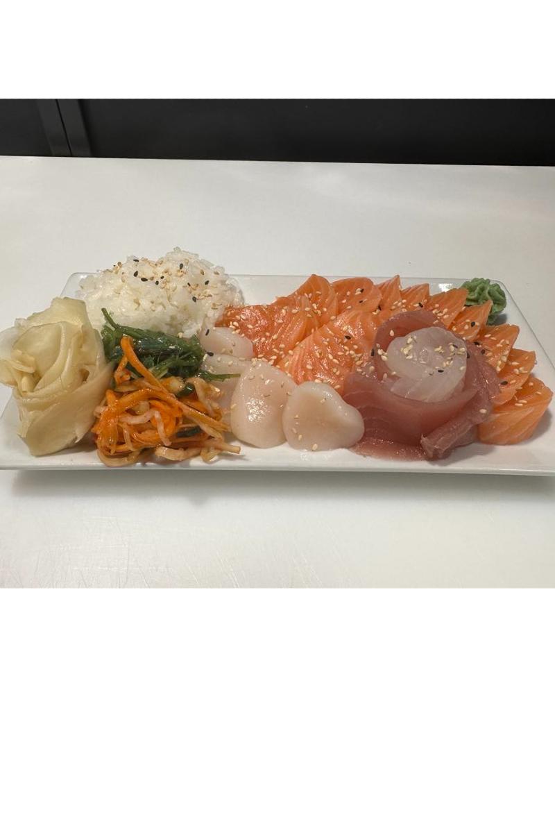 Laks, kamskjell,kveite,tunfisk serveres med sesamfrø, ris purre og vår hjemmelagde ponzusaus