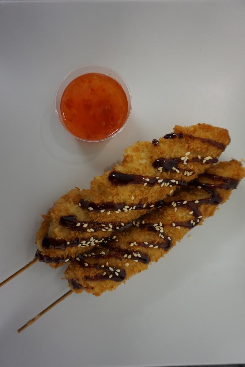 serveres med teriyaki saus, sursøt saus og sesamfrø.